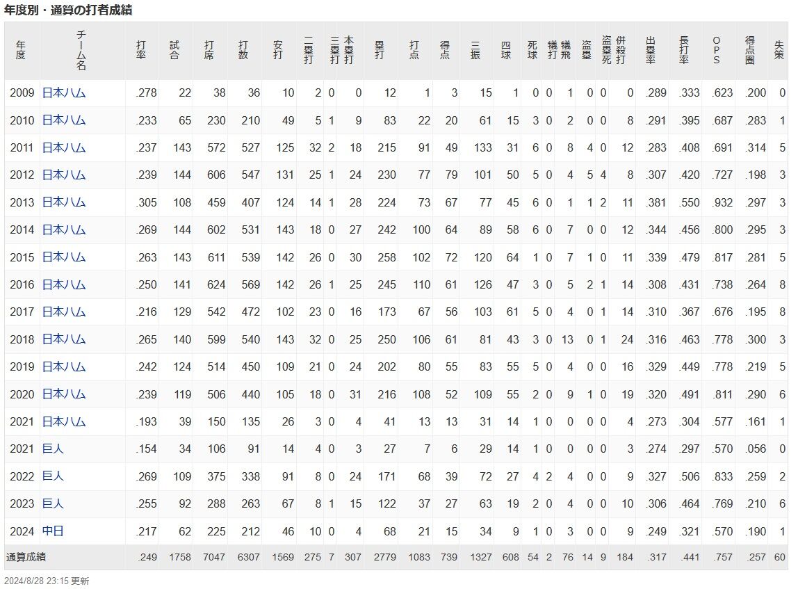 中田翔、通算1569安打307本塁打1083打点←これの感想