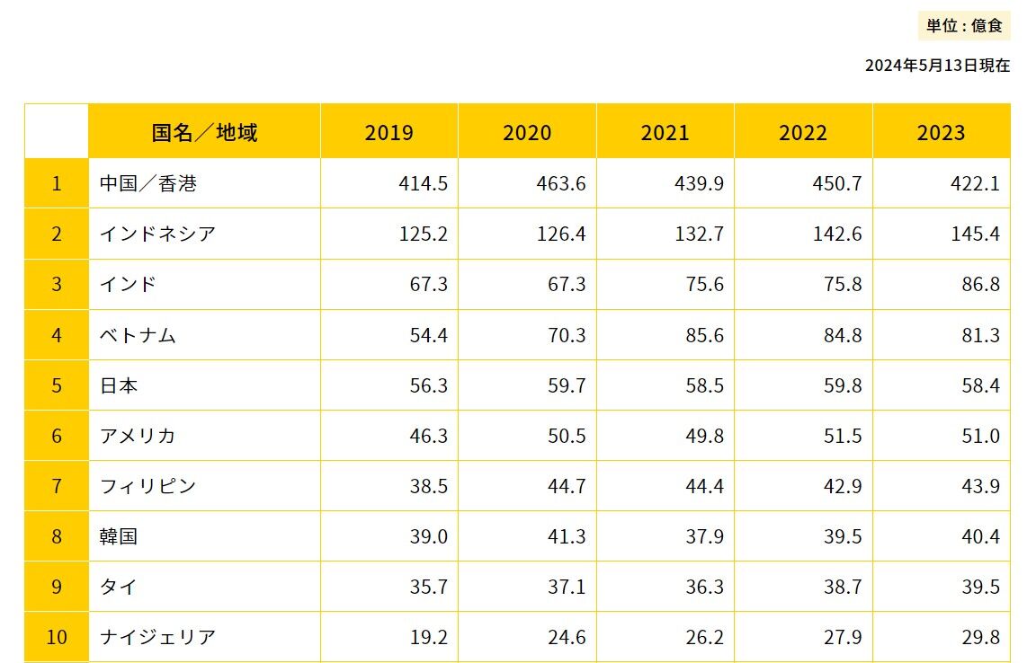 『WINA』(World Instant Noodles Associationの略:「世界インスタントラーメン協会」)のデータによれば、