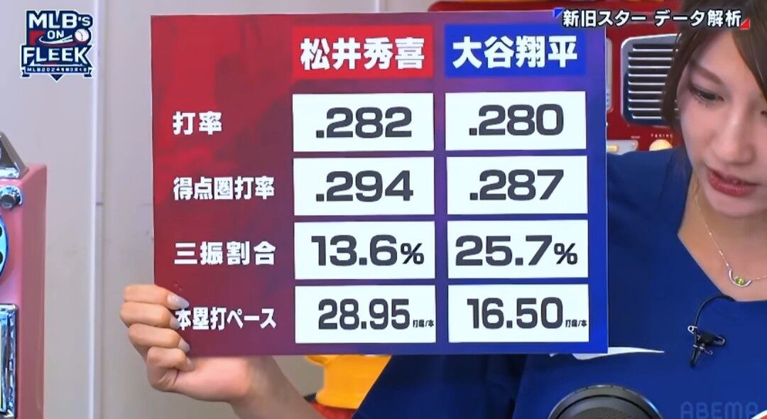 その上で、「もし日本だったら、松井さんも大谷選手みたいな数値が出ると思う。MLBはスゴい投手が多いので、ホームランを打とうと思ったら松井さんのようにライト方向に引っ張らないといけなくなる」と推測した。