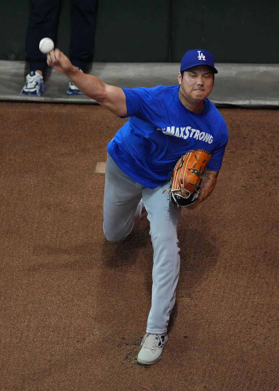試合前には、キャッチボール後にブルペン入りし、捕手が座った状態で速球を10球投げた。関係者によると、球速は時速92マイル(約148キロ)をマーク。昨年9月の右肘手術後、最速とみられ、投手としてのリハビリが順調に進んでいることをうかがわせた。