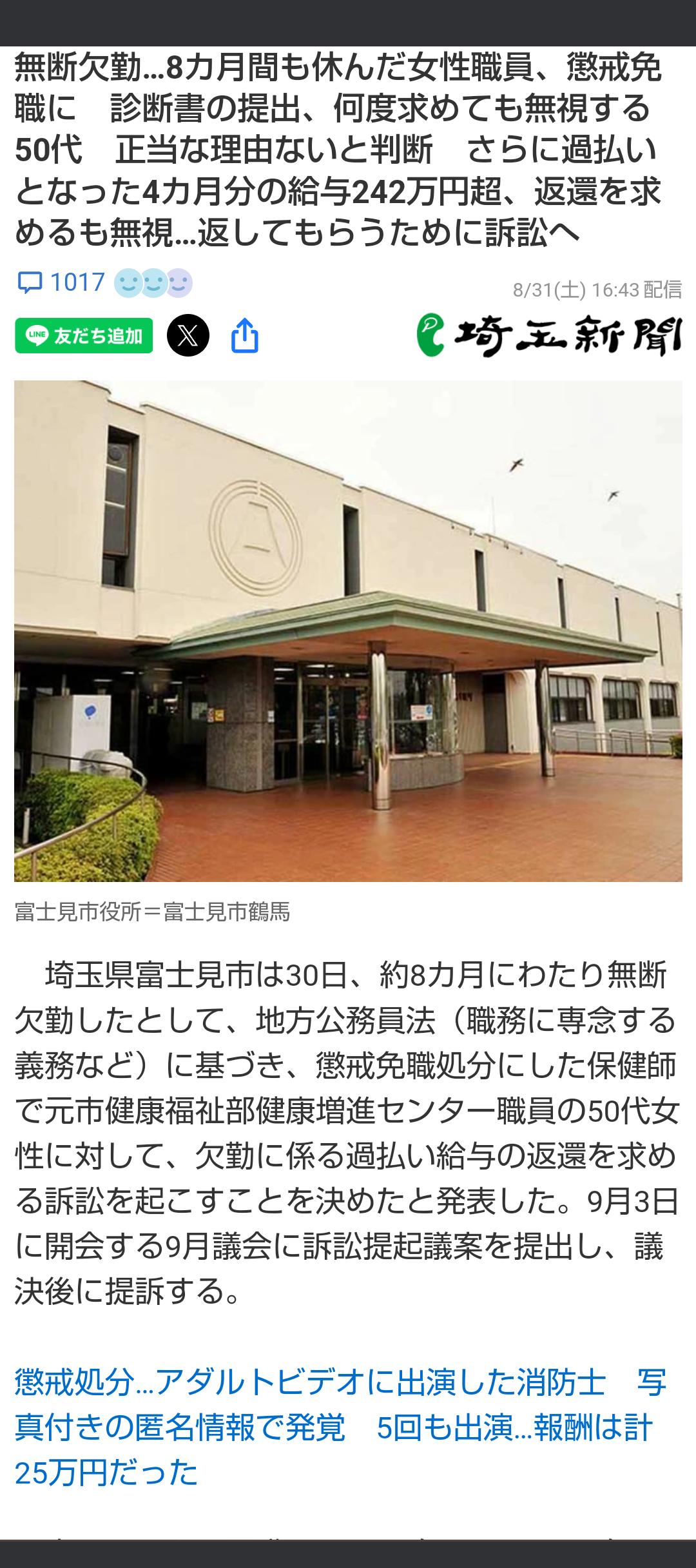 【悲報】8ヶ月間無断欠勤していた市役所の50代のおばちゃん懲戒免職 おまけに訴訟へ