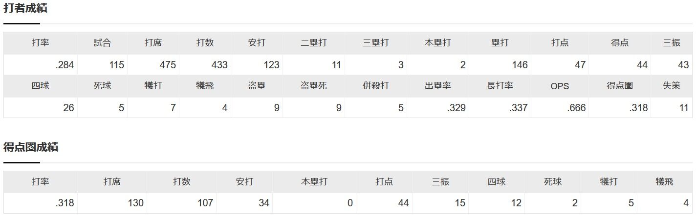(21)打率.298 5本 35打点 4盗塁 出塁率.320 OPS.719 WAR+1.4