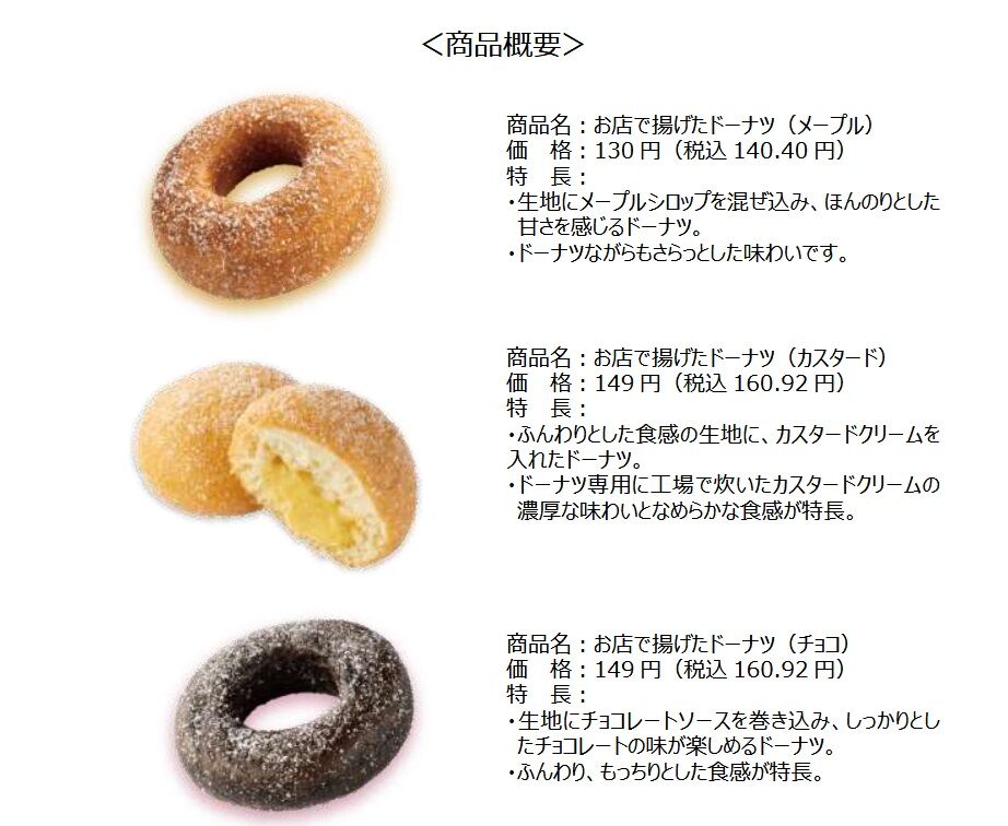発売するのは「お店で揚げたドーナツ」。工場で生地から製造したドーナツを急速冷凍して各店舗に送り、店内で揚げて提供する。メープル、カスタード、チョコ味を用意し、価格は140~160円。