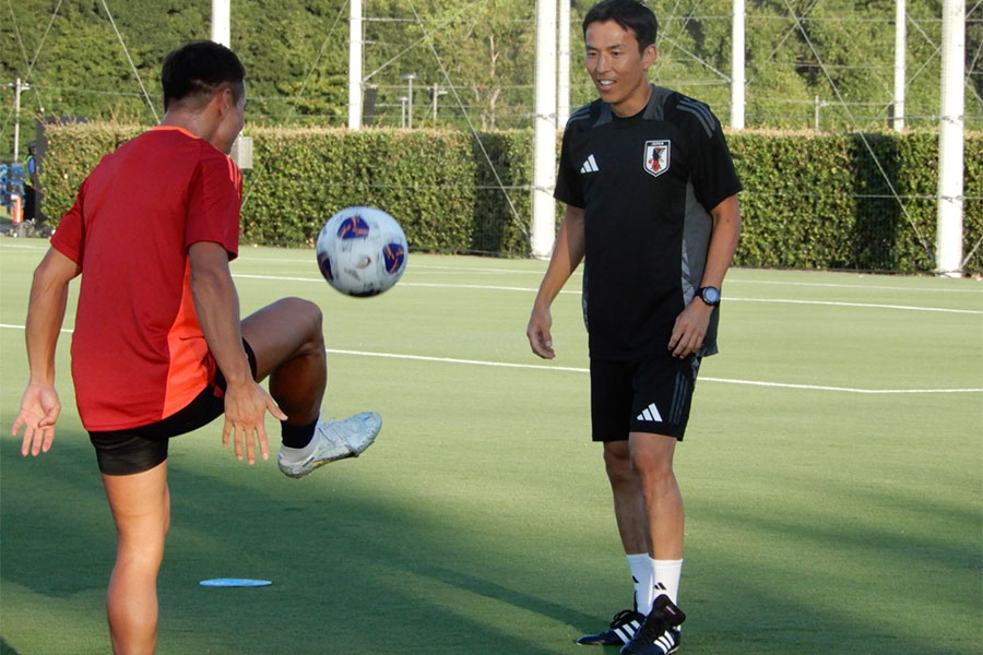 この日、長友は前日1日に試合があったDF高井幸大を除く国内組FW細谷真大、DF望月ヘンリー海輝、DF中山雄太とともに約40分間軽めの調整。ピッチに出た長谷部コーチとも“鳥かご”でボールを奪い合うなど、精力的に身体を動かした。長友はピッチで再会を果たした瞬間、