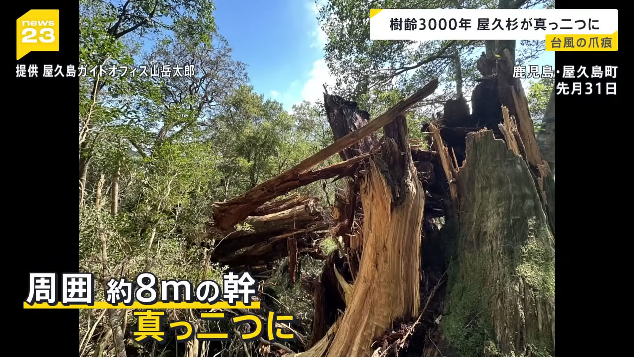 日本列島に被害をもたらした台風10号が接近した鹿児島県・屋久島で、樹齢3000年といわれる白谷雲水峡の「弥生杉」が倒れるなどの被害が出ている。