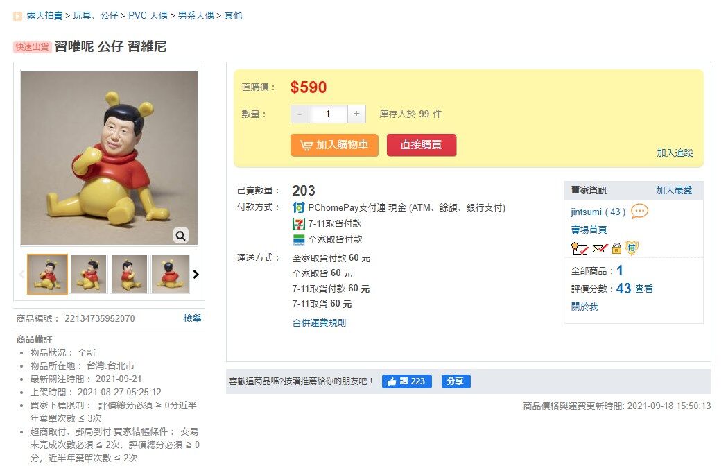 値段は590ドル(台湾ドル)で約2300円ほど。日本への発送も行っている。既に200個以上が売れており、 習近平ファンなのかプーさんファンのどちらが買ったのかは不明。