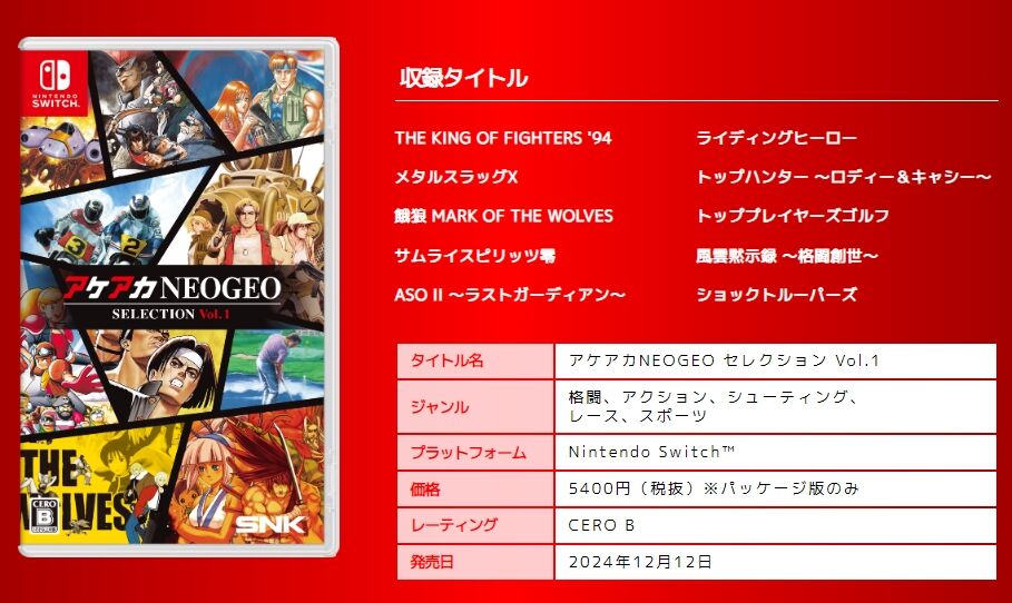 株式会社SNKは、「NEOGEO」の名作・傑作ゲームを10タイトル収録したコレクション作品『アケアカNEOGEO セレクション Vol.1』、『アケアカNEOGEO セレクション Vol.2』を、Nintendo Switch™のパッケージ版として、2024年12月12日(木)に2本同時発売することをお知らせいたします。