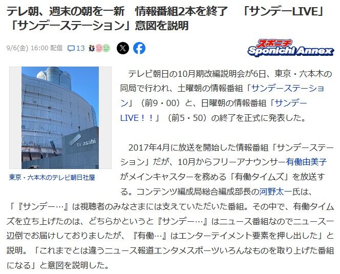 テレビ朝日の10月期改編説明会が6日、東京・六本木の同局で行われ、土曜朝の情報番組「サンデーステーション」(前9・00)と、日曜朝の情報番組「サンデーLIVE!!」(前5・50)の終了を正式に発表した。