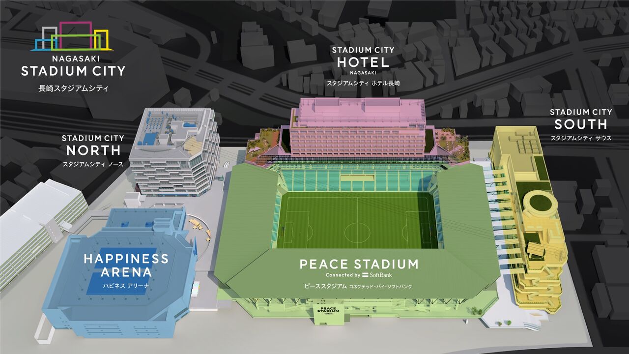 JR長崎駅から徒歩約10分で、敷地面積は約7万5000平方メートル。サッカー場の「ピーススタジアム」(約2万人収容)やアリーナ施設「ハピネスアリーナ」(約6000人収容)、ショッピングモール、ホテル、オフィスビルで構成される。総事業費は約1000億円。