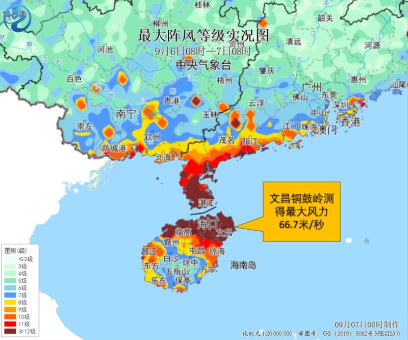 ↑海南省文昌市銅鼓嶺では「最大風力66.7m/秒」という図。