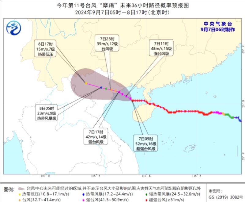 2024年09月06日16:20頃、超弩級の台風11号(やぎ座:日本命名)(レベル17以上、風速62メートル、915hPa)が、中国の南端、海南省文昌市の海岸に上陸しました。