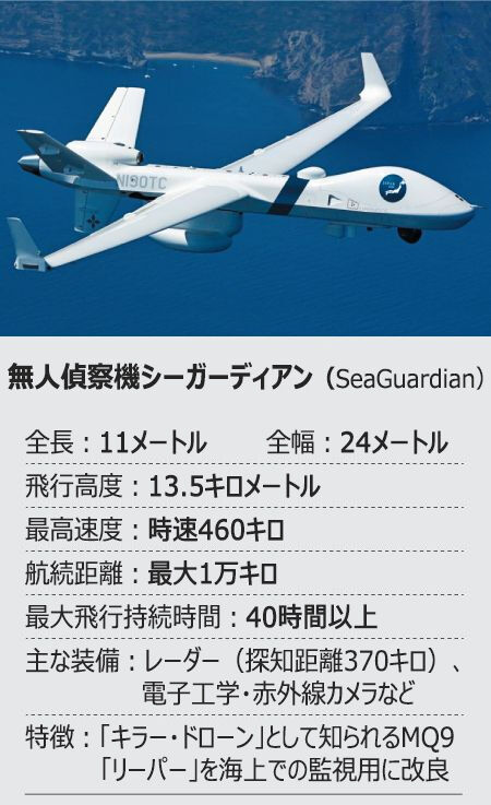 日本の海上保安庁と海上自衛隊が最大で40時間以上の監視偵察活動が可能な米国製の最新鋭大型無人偵察機「シーガーディアン(Sea Guardian)」を導入する方向で検討していることがわかった。来年から2026年頃までの導入を目指すという。