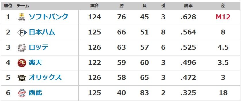 2位ハム首位SBと残り18試合で8ゲーム差←これ