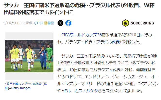 サッカー王国に南米予選敗退の危機…ブラジル代表が4敗目、W杯出場圏外転落まで1ポイントにhttps://news.yahoo.co.jp/articles/582317d8561db3b0f53558ae6a910c992f4c4ada