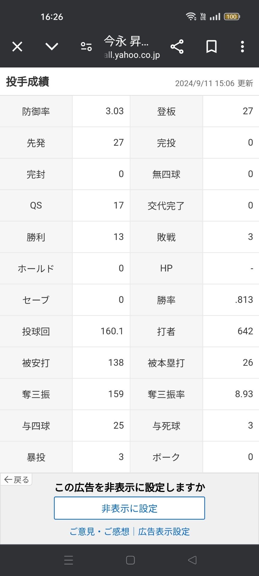 今永昇太「13勝3敗 防御率3.03 投球回160.1 奪三振率8.93 whip1.02」←これについての率直な感想www