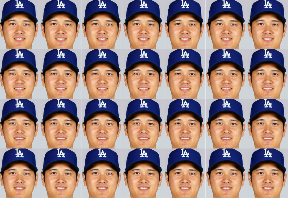 そこに写っていたのは、キャップを被って笑顔を作った大谷。しかも画像ぎっしりに同じ顔が28個も並べられており、強烈なインパクトを放っている。
