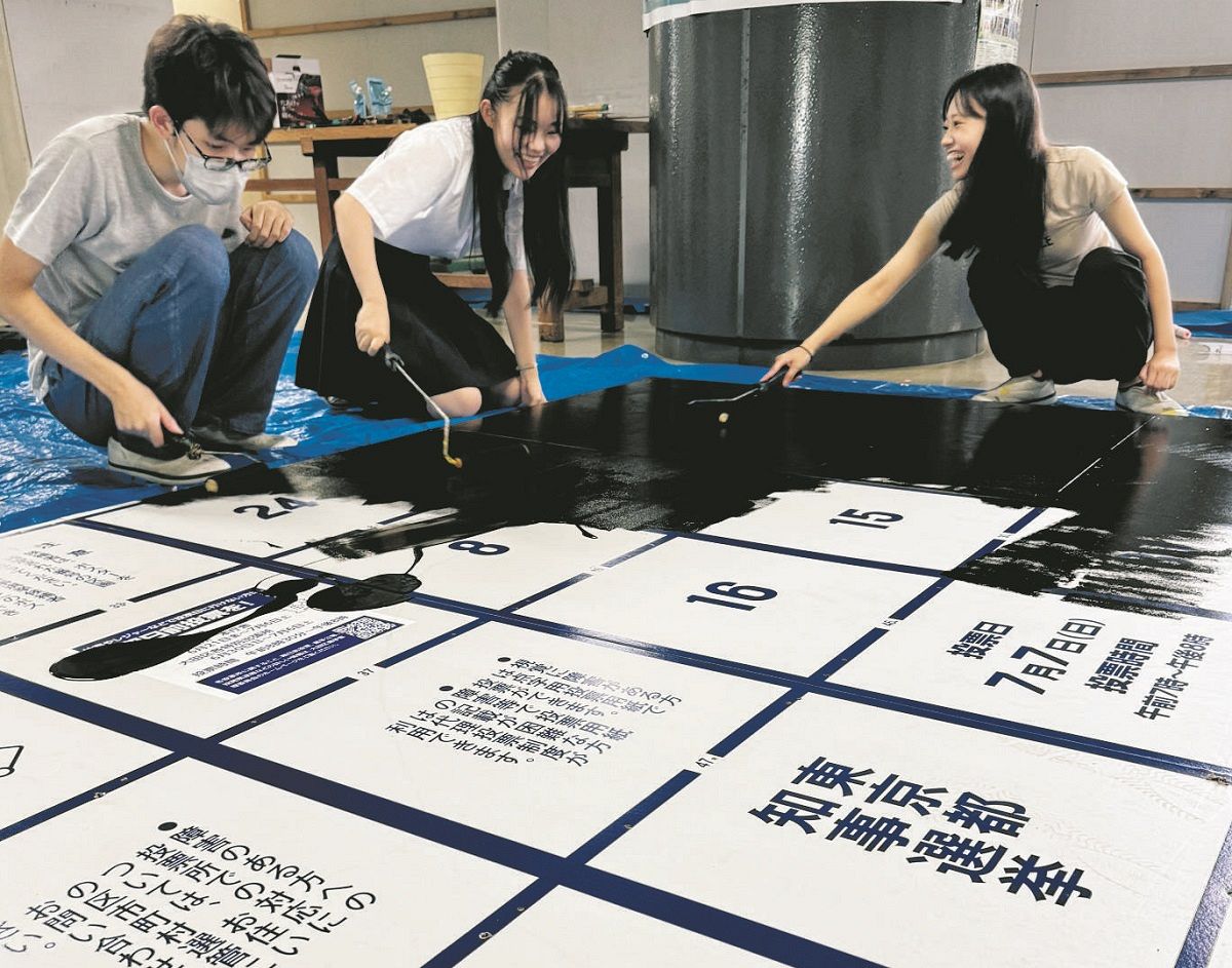 ブルーシートに大きな板を置き、黒ペンキで丁寧に塗りつぶしていく生徒ら。