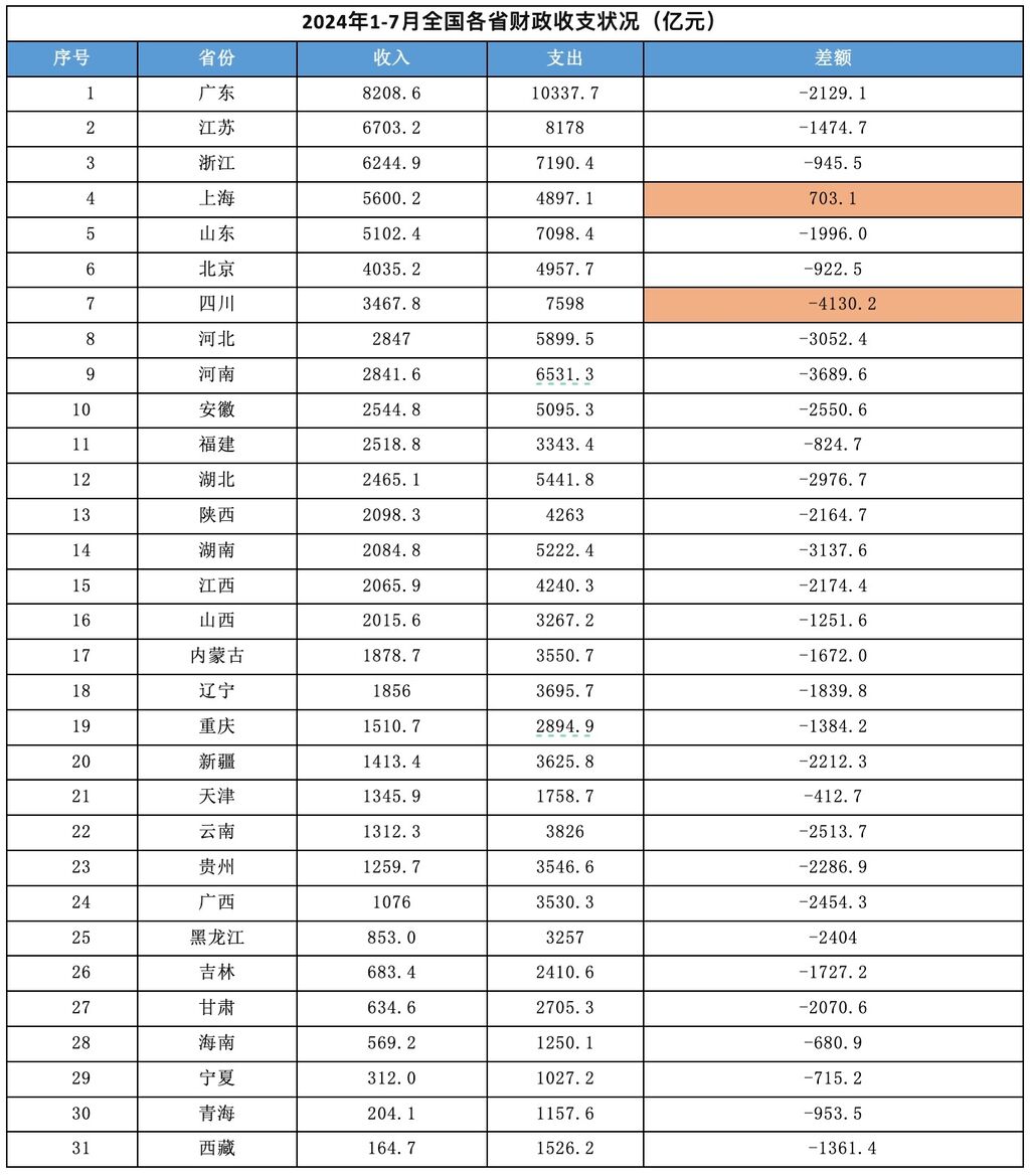 最も赤字がひどいのは四川省で「収支(収入 – 支出):-4,130.20億元」です。日本円換算で「約8兆2,604億円の赤字」です。