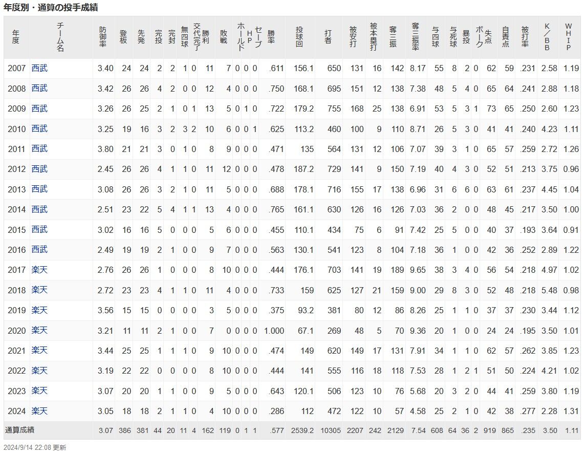楽天・岸孝之(40)4勝10敗 112回 防3.05 ←率直な感想