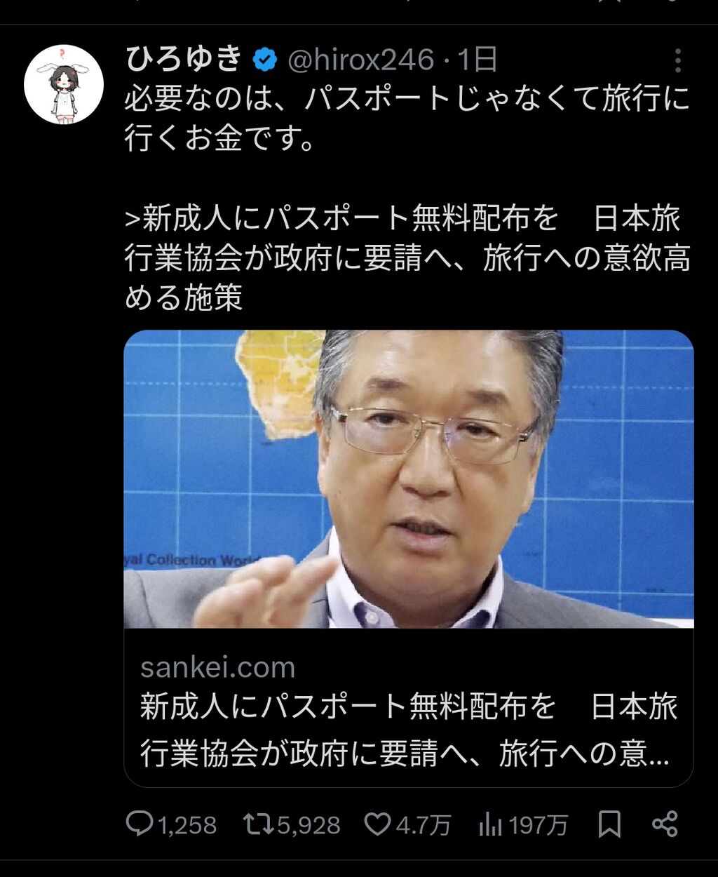 >新成人にパスポート無料配布を 日本旅行業協会が政府に要請へ、旅行への意欲高める施策 https://t.co/oRNjM40ciQ