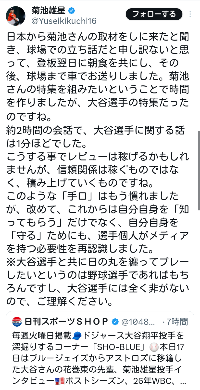 約2時間の会話で、大谷選手に関する話は1分ほどでした。… https://t.co/jcROHCSi99— 菊池雄星 (@Yuseikikuchi16) September 17, 2024