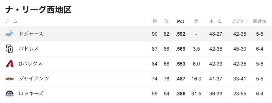 ドジャース 90勝62敗 勝率.592(ナ・リーグ西地区首位)
