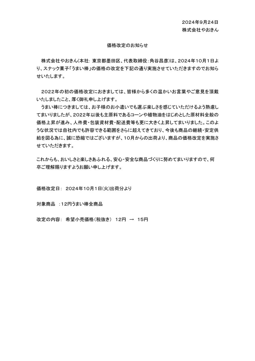 書面にて発表され、値上げの経緯について「2022年の初の価格改定におきましては、皆様から多くの温かいお言葉やご意見を頂戴いたしましたこと、厚く御礼申し上げます。うまい棒につきましては、お子様のお小遣いでも選ぶ楽しさを感じていただけるよう熟慮してまいりましたが、2022年以後も主原料であるコーンや植物油をはじめとした原材料全般の価格上昇が進み、人件費・包装資材費・配送費等も更に大きく上昇してまいりました」と説明。