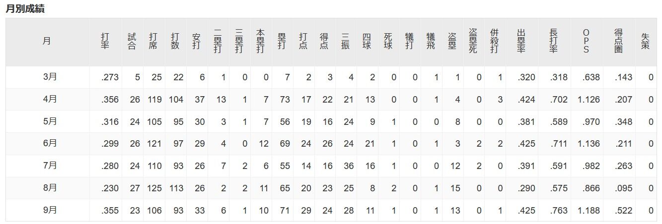 9月大谷(.355 10HR 29打点 13盗塁 盗塁死0 得点圏.522)