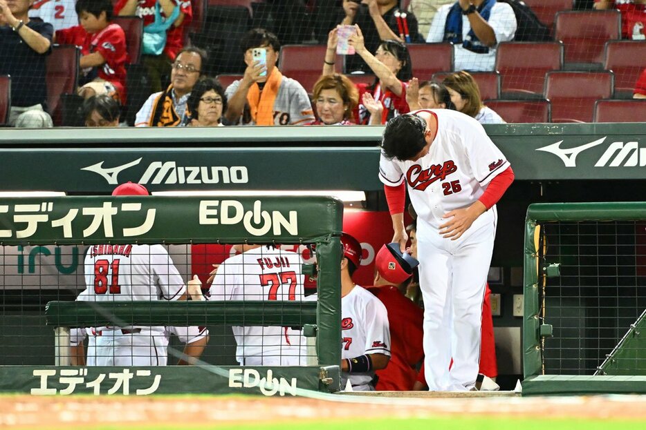 試合の主導権を相手に握られた終盤は、防戦一方で中継ぎ陣が5失点。7点差をつけられた9回も、最後の打者・末包が二ゴロに打ち取られ試合終了。新井貴浩監督(47)はリーグVを決めた巨人ナインが、自軍の本拠地マウンドで歓喜する姿をジッと見つめ続けたあと、敵将の胴上げを見ることなく、深々とグラウンドに一礼し、ベンチを後にした。