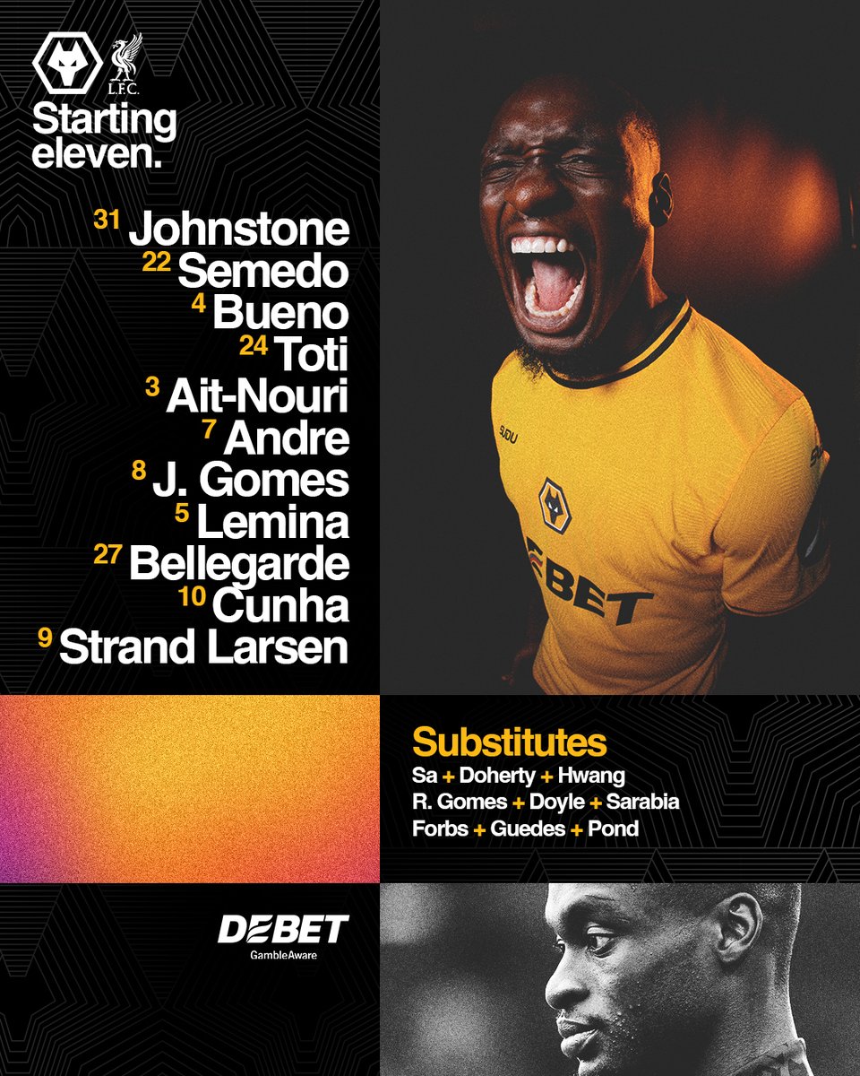 Johnstone; Semedo, Bueno, Toti, Ait-Nouri; Andre, Joao Gomes, Lemina(C), Bellegarde, Matheus Cunha; Strand Larsen.