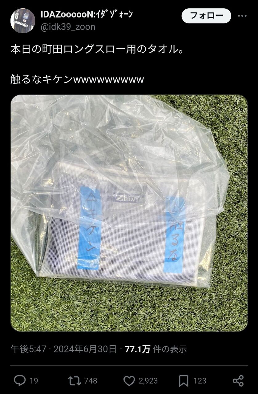 【悲報】本日の町田のロングスロー用タオル「触るなキケンと書かれてるwwwwwwwwwwww」
