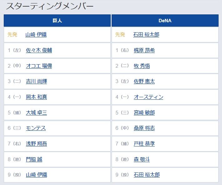 【巨人対DeNA25回戦】 1(左) 佐々木 俊輔 4(一) 岡本 和真