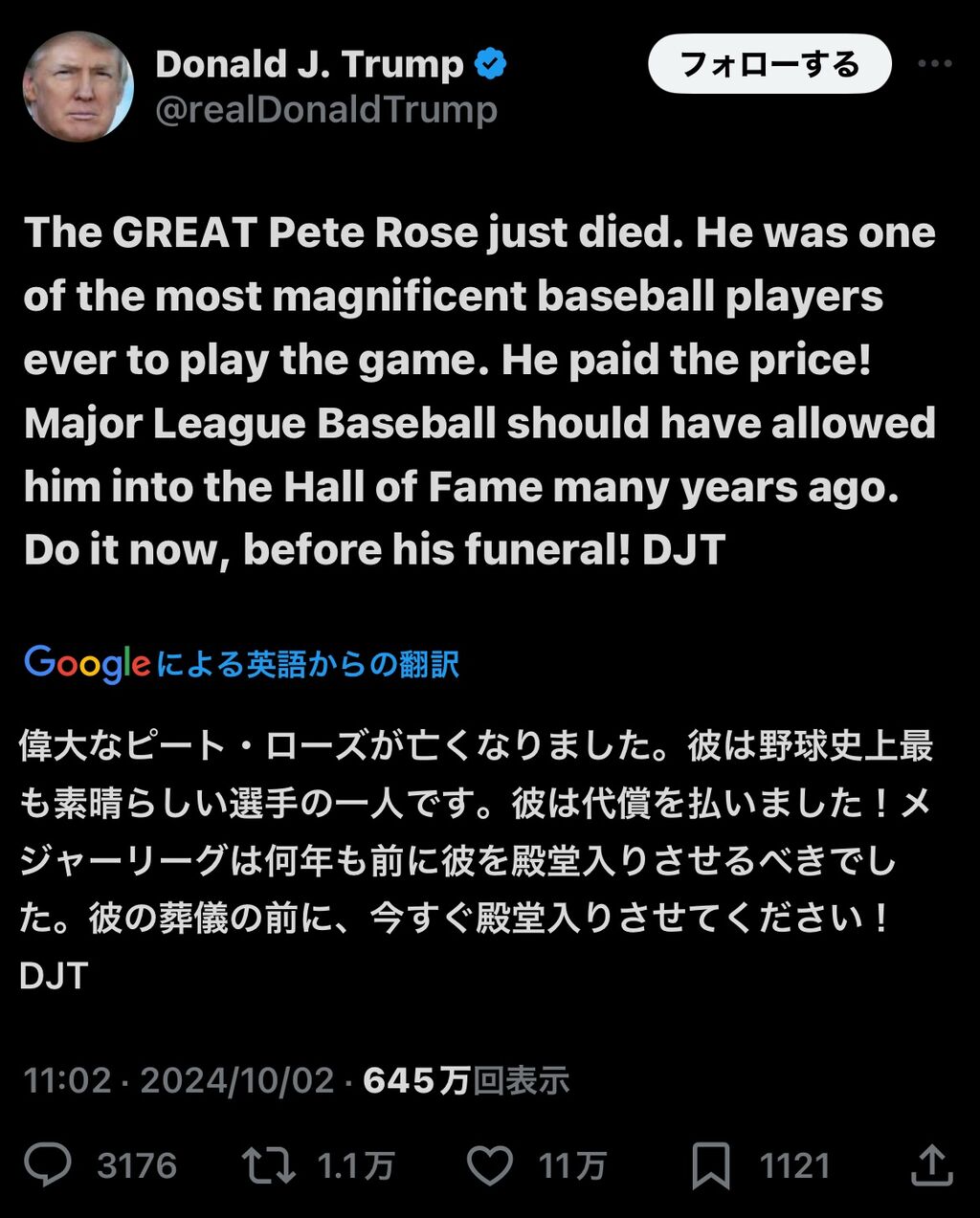 トランプ「野球史上最も偉大な選手の一人が亡くなった。彼を殿堂入りさせるべきだ」