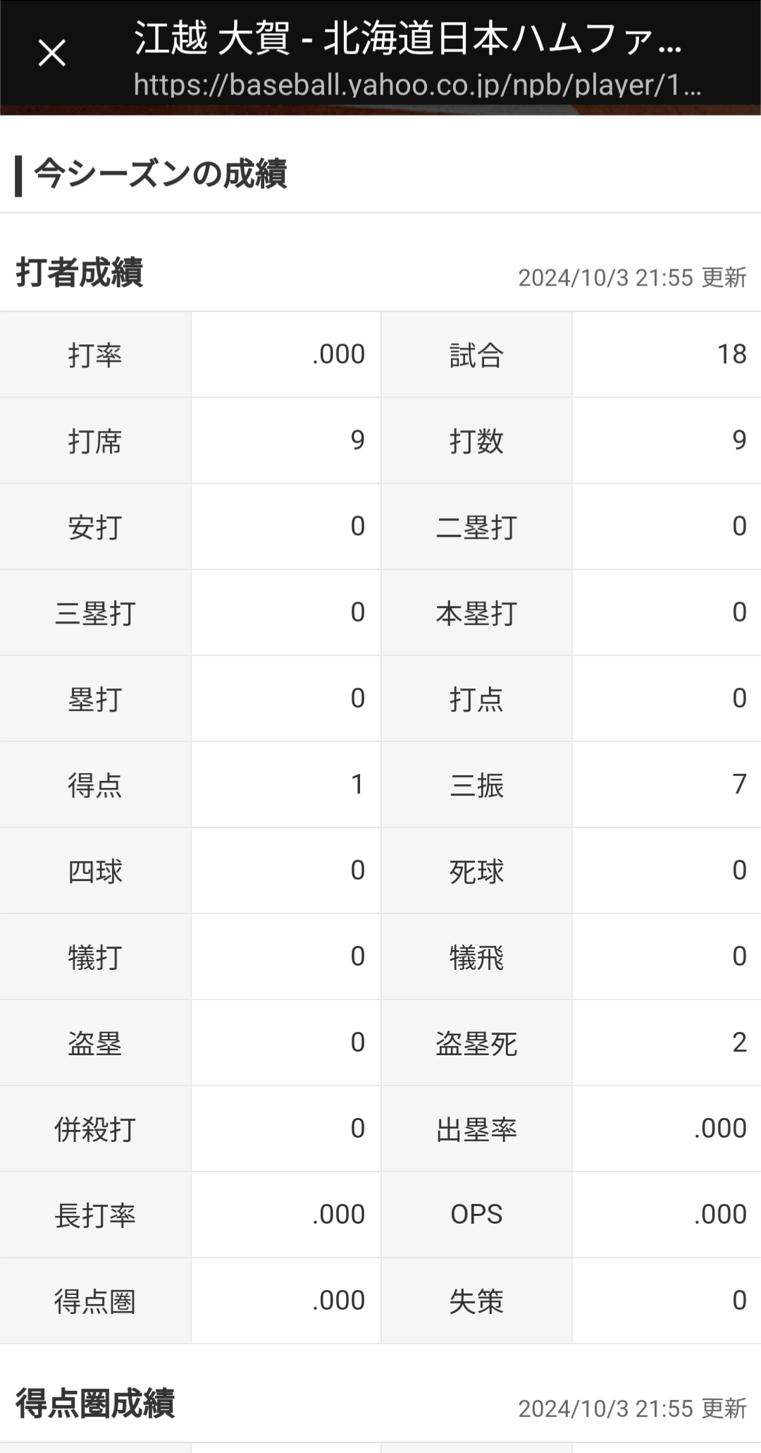 江越大賀 13試合 .778(9-7) 0本 0打点 0盗塁 2盗塁死