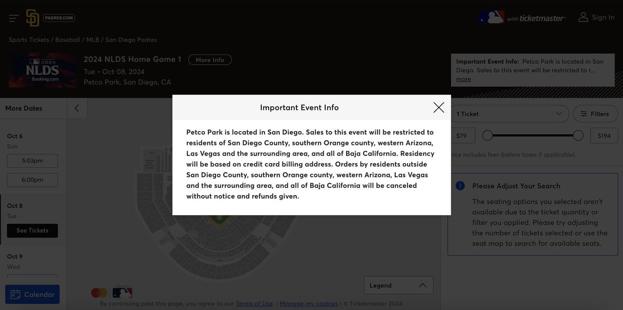 「重要なお知らせ」と付され、「ペトコパークはサンディエゴに位置しています。このイベントの発売はサンディエゴ・カウンティ、サザン・オレンジカウンティ、ウェスターン・アリゾナ、ラスベガス、またはその周辺の居住者のみに制限されています。