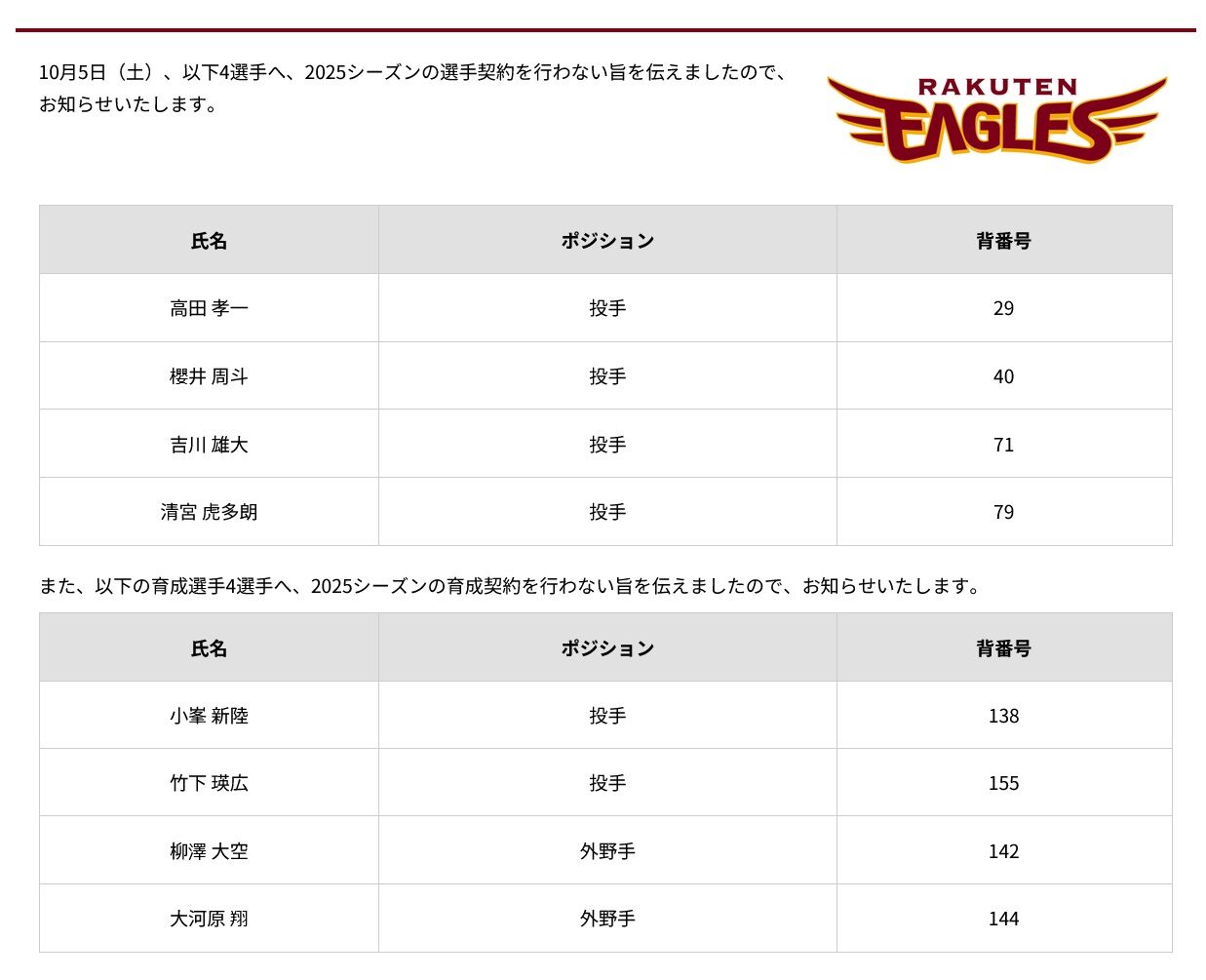 楽天 高田、清宮、桜井、吉川に戦力外通告 育成含め計8人 清宮は今季開幕直後に支配下登録勝ち取るも…
