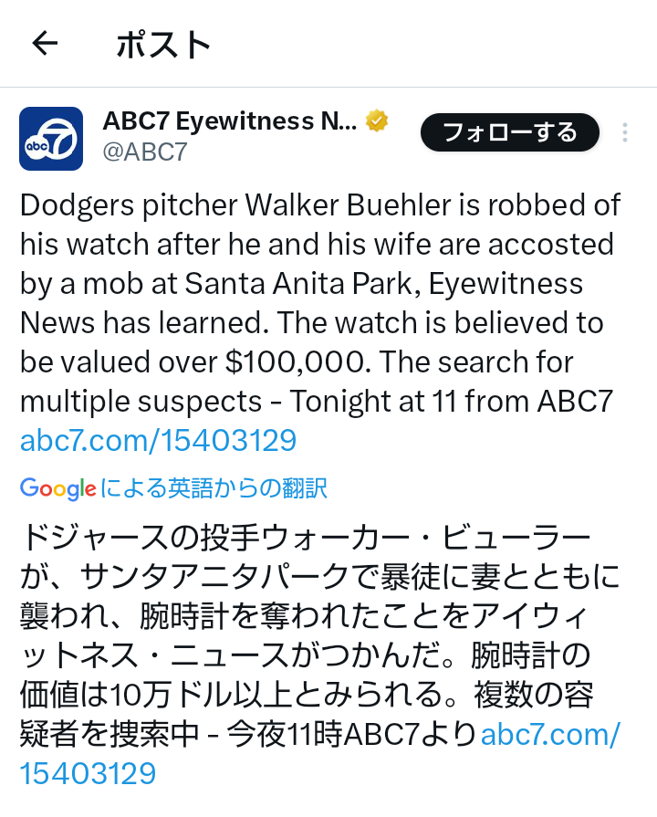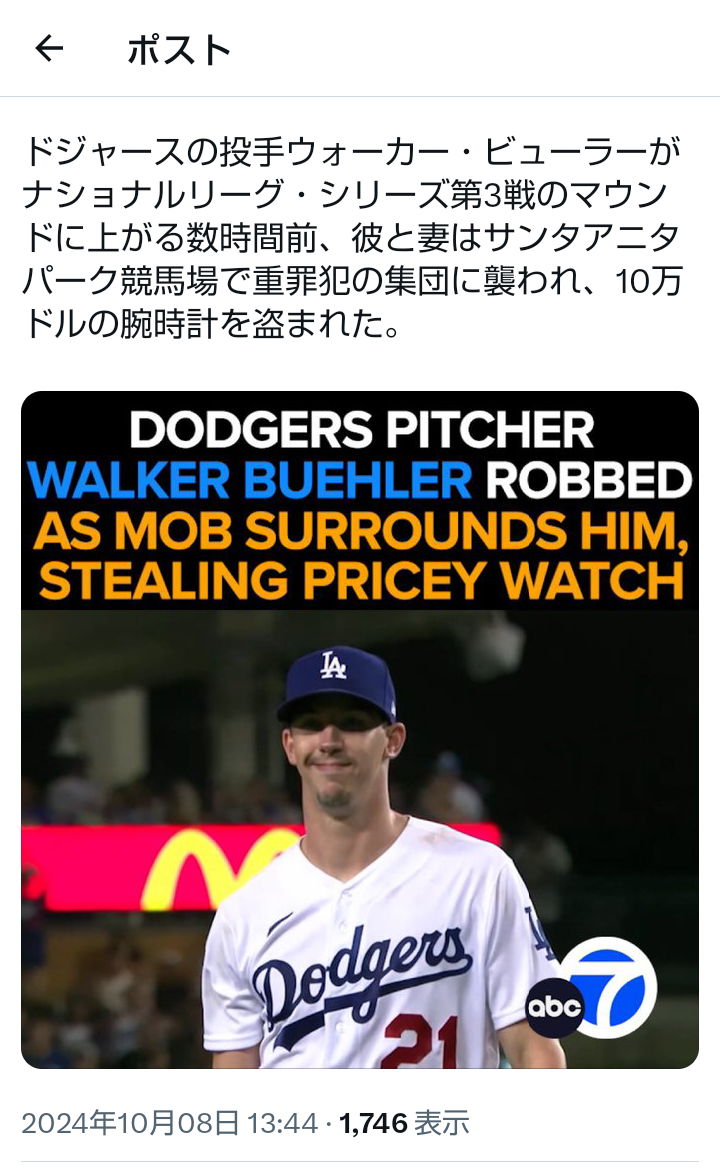 【悲報】ドジャース逝く…明日先発予定のビューラーと妻が窃盗被害…被害総額1400万円超か