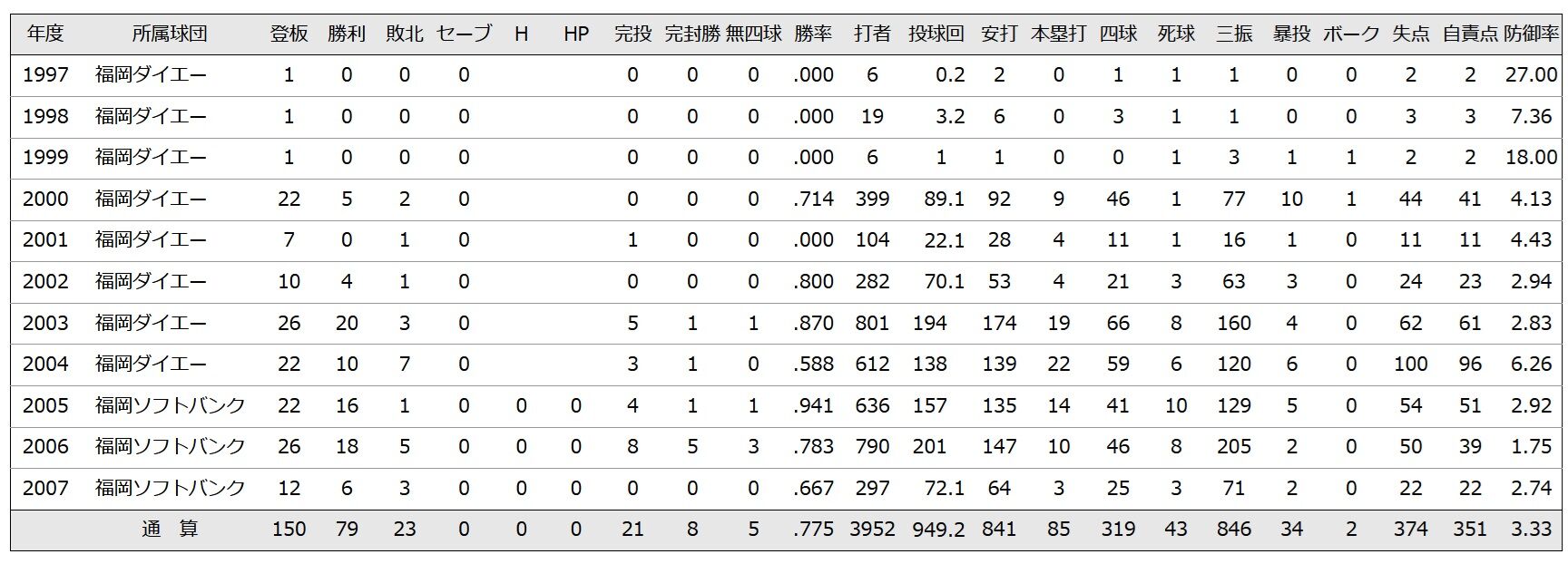 04年斉藤和巳(ダ)10勝7敗防御率6.26投球回数138回K/BB2.42