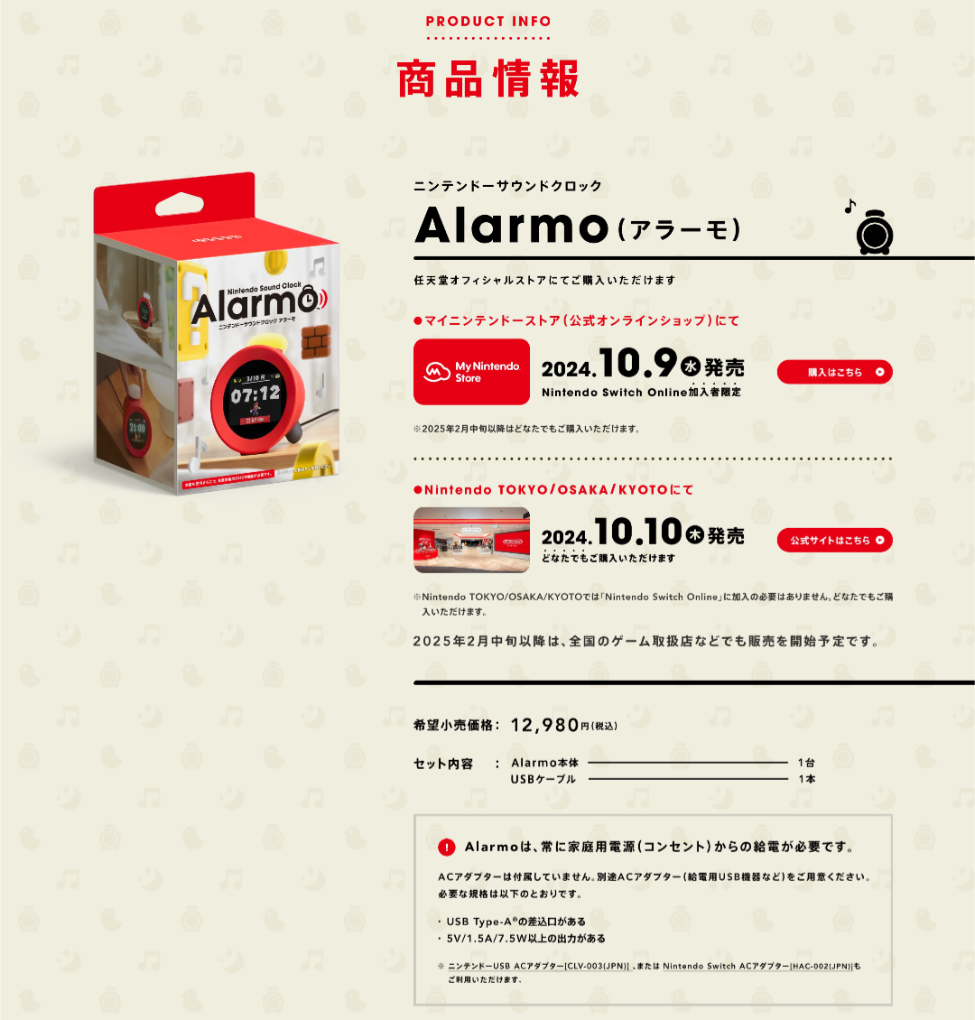 マイニンテンドーストア(Nintendo Switch Online加入者限定)、Nintendo TOKYO/OSAKA/KYOTOにてご購入いただけます。#Alarmohttps://t.co/5hzuzSaYAX— 任天堂株式会社 (@Nintendo) October 9, 2024