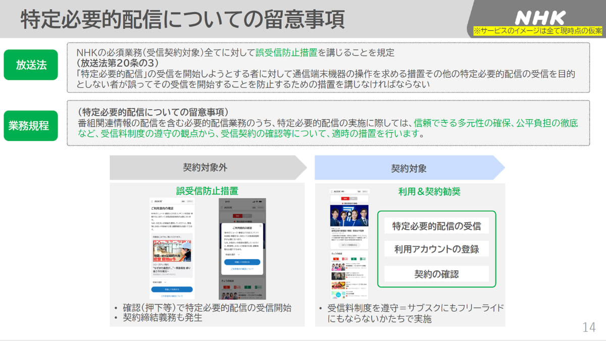 そこでNHKではネットサービス利用の前段において、受信契約が必要になる旨の案内を表示。さらに、掲示内容の同意を表すボタン操作(クリック)を行なうことで“契約対象”とする仕組みとした。