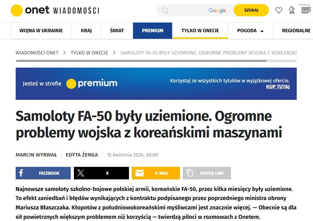 ⇒参照・引用元:『ONET』「Samoloty FA-50 by?y uziemione. Ogromne problemy wojska z korea?skimi maszynami」