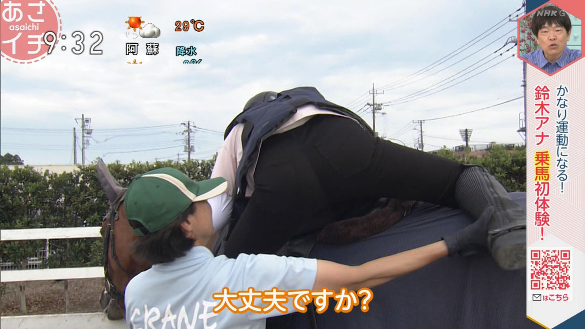 鈴木奈穂子アナがピタパンで馬にまたがるお尻をアップで撮られていました! 激しい腰の動きもセクシーです! GIF動画x3&明るさ調整版付きで! [2024年10月9日 あさイチ]