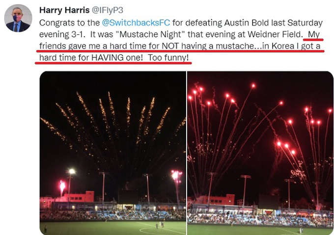 3日、ハリス前大使のSNSを見ると、最近、米国ユナイテッド サッカーリーグ(USL)所属のコロラドスプリングス・スイッチバックスFC vs オースティン・ボールドFCのサッカー試合を見た感想と関連写真が掲載されている。