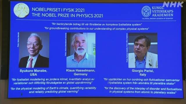 ことしのノーベル物理学賞の受賞者に、大気と海洋を結合した物質の循環モデルを提唱し、二酸化炭素濃度の上昇が地球温暖化に影響するという予測モデルを世界に先駆けて発表した、プリンストン大学の上級研究員でアメリカ国籍を取得している真鍋淑郎さん(90)が選ばれました。日本人がノーベル賞を受賞するのはアメリカ国籍を取得した人を含めて28人目で、物理学賞では12人目になります。