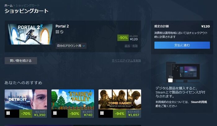 「デジタル製品を購入すると、Steam上で製品のライセンスが付与されます。」との注意書きが表示されることを確認できました。