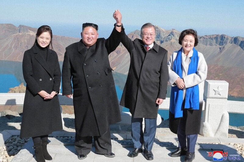 北朝鮮北部の白頭山で記念撮影する金正恩朝鮮労働党委員長(左から2人目、肩書は当時)と韓国の文在寅大統領(右から2人目)。両端は金氏の妻の李雪主氏(左)と文氏の妻の金正淑氏=2018年9月20日、朝鮮中央通信・朝鮮通信