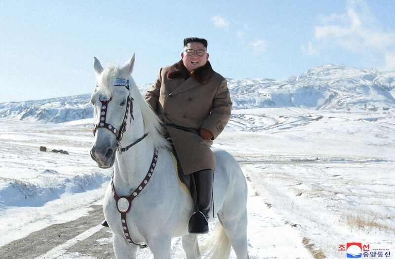 白馬に乗って両江道の白頭山を登る金正恩朝鮮労働党委員長(肩書は当時)。日時は不明。朝鮮中央通信が2019年10月16日に報じた=朝鮮中央通信・朝鮮通信