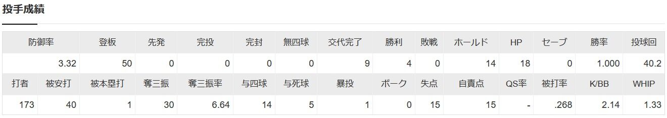 吉田輝星(23) 50試合 40.2回 4勝0敗 18HP 防御率3.32 被打率.268 K/BB2.14 WHIP1.33←コレ