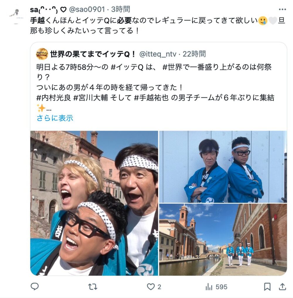 @rii8711返信先:@itteq_ntv 笑いあり感動ありの最高な回でした! どうか次は手越祐也を日テレに呼んで下さい。スタジオにいる手越くんが見たいです🥹
