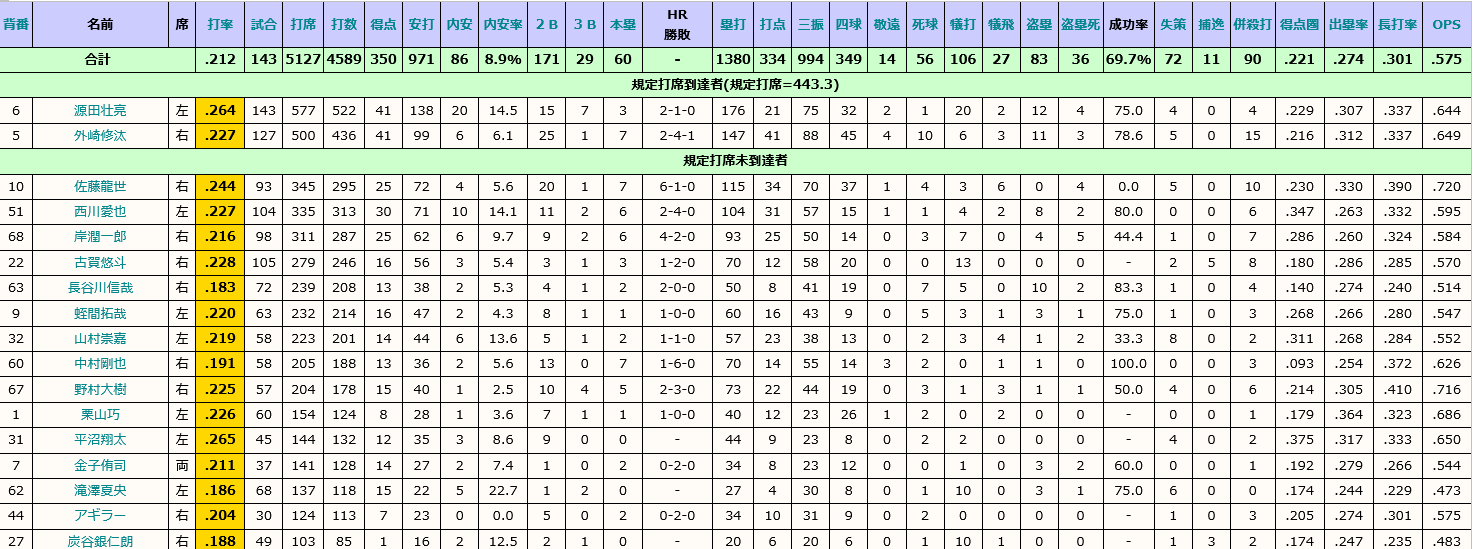 西武ライオンズ チーム打率.212(パリーグ史上最低記録)←これあんま話題になってないけど